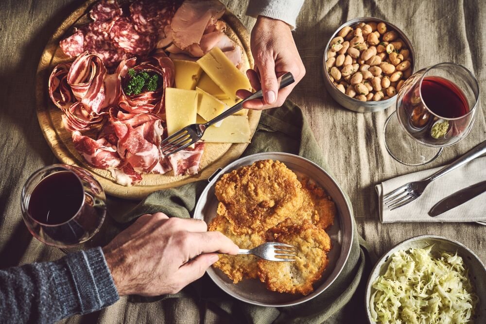 Un menù perfetto da condividere: un grande vassoio di tortèi fumanti al centro della tavola e ognuno li accompagna come preferisce: formaggi dei caseifici locali, lucanica, speck, mortandèla, carne salada…e l’immancabile insalata di cavolo cappuccio e fagioli borlotti (meglio ancora con un tocco di cipolla)!