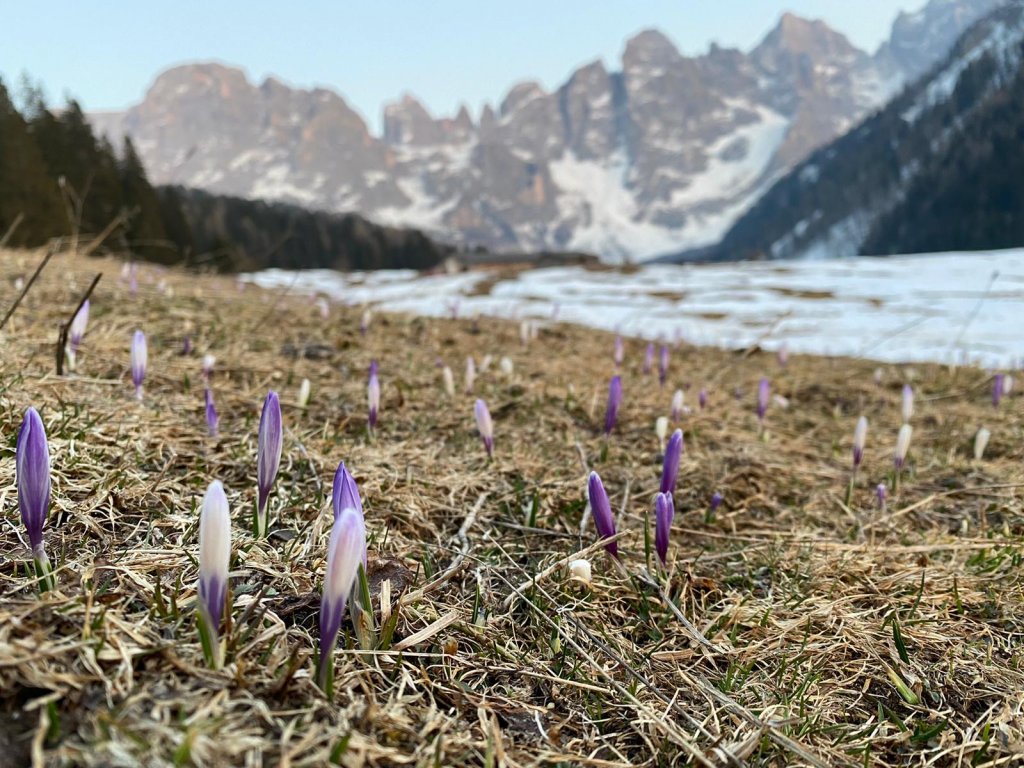 Sulle Dolomiti il bianco candore della neve inizia a lasciare spazio al verde dei prati che iniziano ad accogliere le primule, le violette, le erike, il tutto incorniciato dalle cime maestose che si scagliano nel cielo azzurro. I raggi del sole ora riscaldano la pelle, la magia e la sensazione di libertà di partire al mattino con la giacca antivento e trovarti a mezzogiorno a prendere il sole in maniche corte, con la schiena appoggiata alle pareti di qualche baita non ha prezzo!