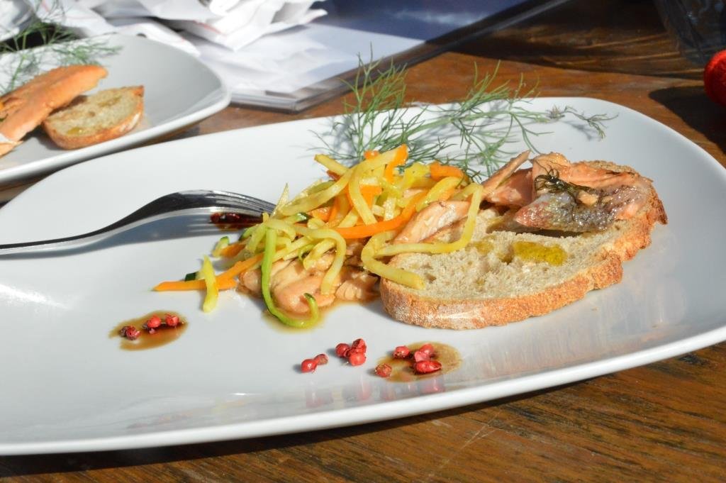 Small fillet of trout marinated in Nosiola wine with aromatic herbs on a toasted slice of bread of Valle dei Laghi ‘0 miles’ Ingredients