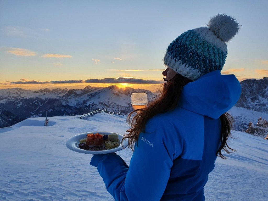 Salire sul tetto delle Dolomiti, ai 2950 mt di quota del Sass Pordoi, per godere non solo di un panorama che vi lascerà senza fiato, ma anche di uno gustosissimo apericena farm to table, dal produttore alla tavola, con protagonisti i formaggi della Mèlga de Fascia, i salumi e le carni Felicetti Speck, i particolari profumi e sentori di N'Outa e le gustose mele La Trentina abbinati ai vini trentini Cavit e alle bollicine di montagna Altemasi Trentodoc, con il racconto live dei produttori. A combinare il tutto ci penserà il Rifugio Maria con una proposta d’autore 100% made in Val di Fassa, disponibile anche nella versione for kids, pronta a saziarvi e appagare i vostri palati, ma anche a lasciarvi un simpatico ricordo homemade by Utòl da portare nelle vostre case.