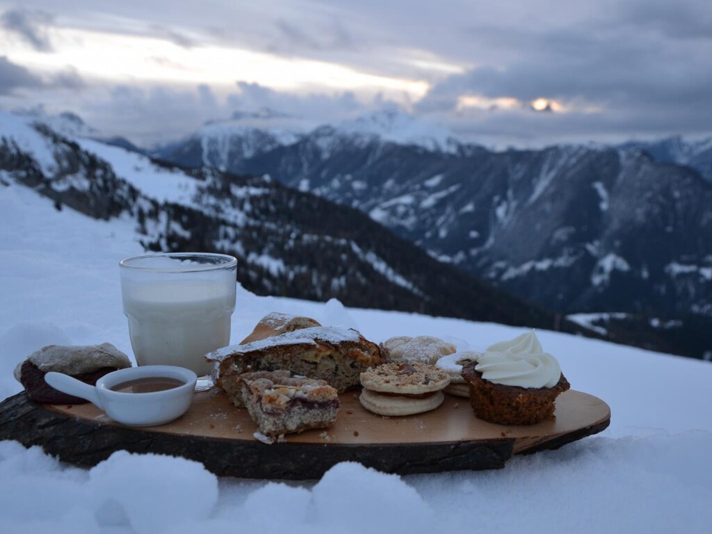 Le prime luci dell'alba, l'aria frizzante, la neve immacolata e un paesaggio dolomitico mozzafiato. Lo spettacolo dell’alba è servito sulla vetta della ski area Latemar Dolomites, accompagnato da una ricca colazione dolce e salata al rifugio Baita Passo Feudo: torte, pane appena sfornato, la migliore scelta di miele e marmellate, formaggi del Caseificio Predazzo e Moena, salumi e affettati a km0 vi ripagheranno della fatica della sveglia anticipata.