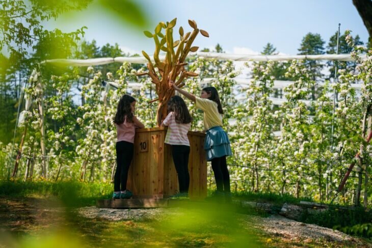 Protagonisti degli incontri sono diversi animali del territorio – dalla volpe alla martora – ciascuno legato a un elemento naturale e a una varietà di mela. Le installazioni in legno, perfettamente integrate nel paesaggio, rendono il percorso intuitivo, coinvolgente e facilmente fruibile anche dai più piccoli.